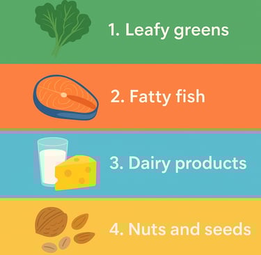 Milk, curd, ragi, paneer, sesame seeds, almonds, spinach, and fish.