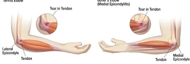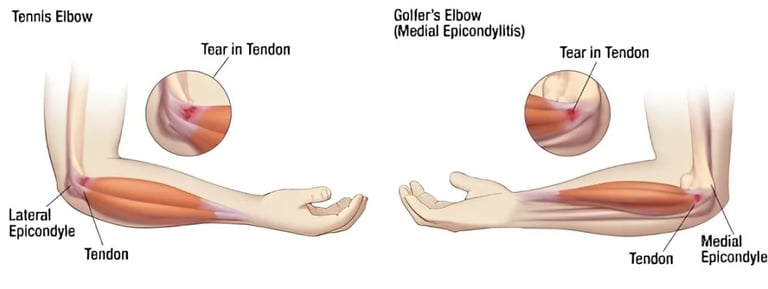 Tennis Elbow involves tendon degeneration in the elbow due to repeated backhand strokes common to tennis. This condition leads to oain on the outside of the elbow. Golfers Elbow impacts the inside of the elbow, due to the inflmaation of the muscles responsible for forearm-flexing.