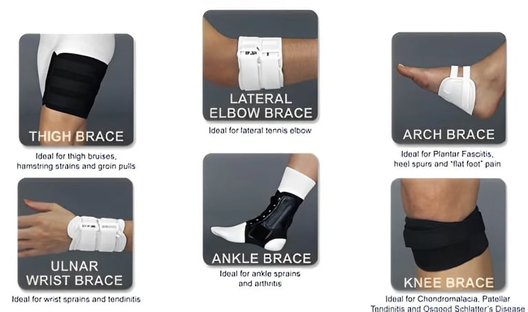 Depending on the site of injury, different braces (e.g., thigh brace, elbow brace, arch brace, wrist brace, ankle brace, or knee brace) can be used to restrict the motion of the impacted part, control pain and speed up the recovery process.