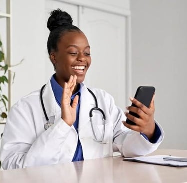 Doctor conducting a telemedicine video consultation using a smartphone in a clinical setting.